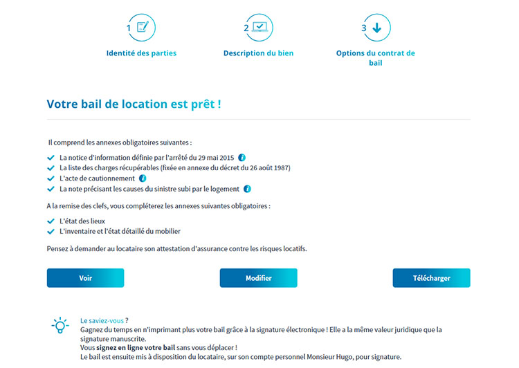 R: Via l'assistant juridique en ligne, vous allez pouvoir compléter votre bail conforme Alur, rédigé par notre avocat qui a ajouté les clauses particulières adaptées à votre situation : vous avez ainsi la garantie d'être protégé en cas de litige avec votre locataire...